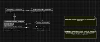 - GameManager : Contient le GameState et le GameData et s'occupe d'initialisé chaque manager référencé dans la prafeb GameManager. Un manager s'occupe de gérer une partie du jeu en particulier et toutes les mécanqiues découles de ces managers afin de limiter l'utilisation de la function update. Notament le TimeManager qui s'occupe