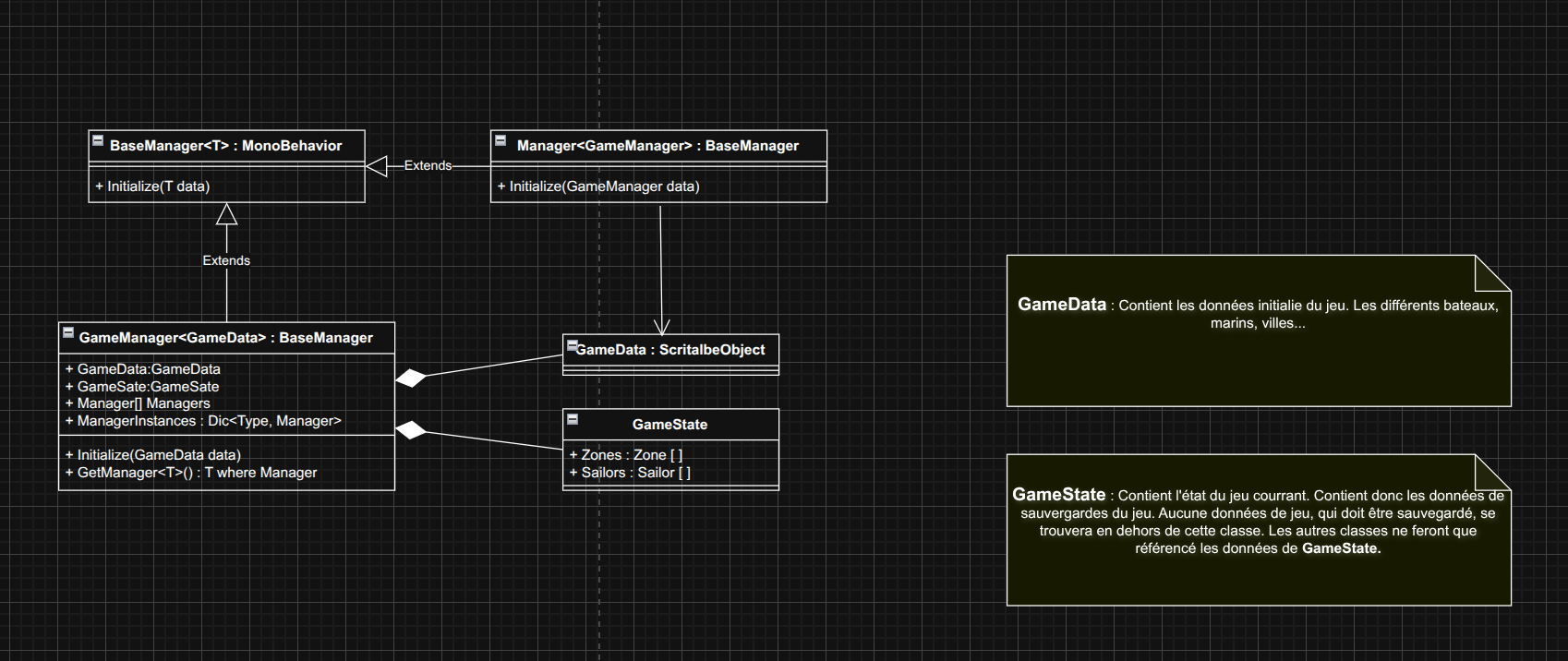- GameState : Représente et ne contient que l'état du jeu pour être facilement sérialisable. Peut contenir des références vers des Scriptable Object. Pourrait être vu que le model dans le pattern MVC